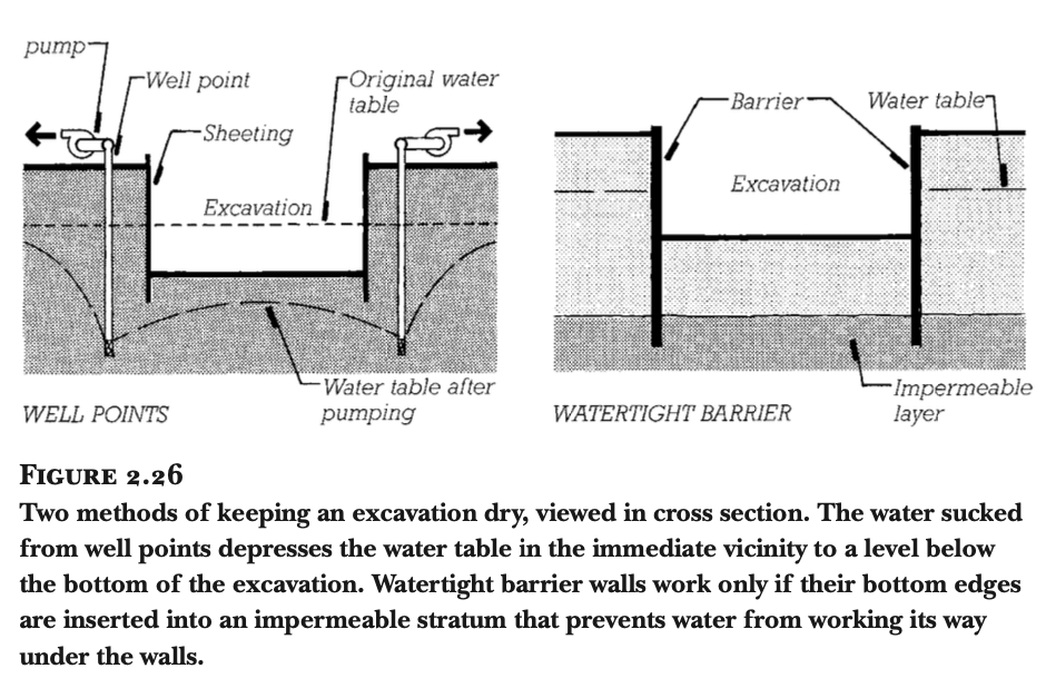이러한 경우, 대안으로 방수벽을 사용할 수 있습니다 (그림 2.26 참조). 슬러리 월과 토양 혼합 벽은 우수한 방수벽이 될 수 있습니다. 시트 파일링(sheet piling)도 사용할 수 있지만, 이음새에서 누수가 발생하는 경향이 있습니다.