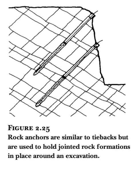 균열이 있는 암반에서의 굴착은 종종 차수벽을 완전히 피할 수 있습니다. 이는 암반의 이음부에 그라우트를 주입하여 안정화하거나, 암반에 구멍을 뚫고 록 앵커(rock anchor)를 삽입하여 암괴를 서로 고정시키는 방법으로 가능합니다 (그림 2.25 참조).