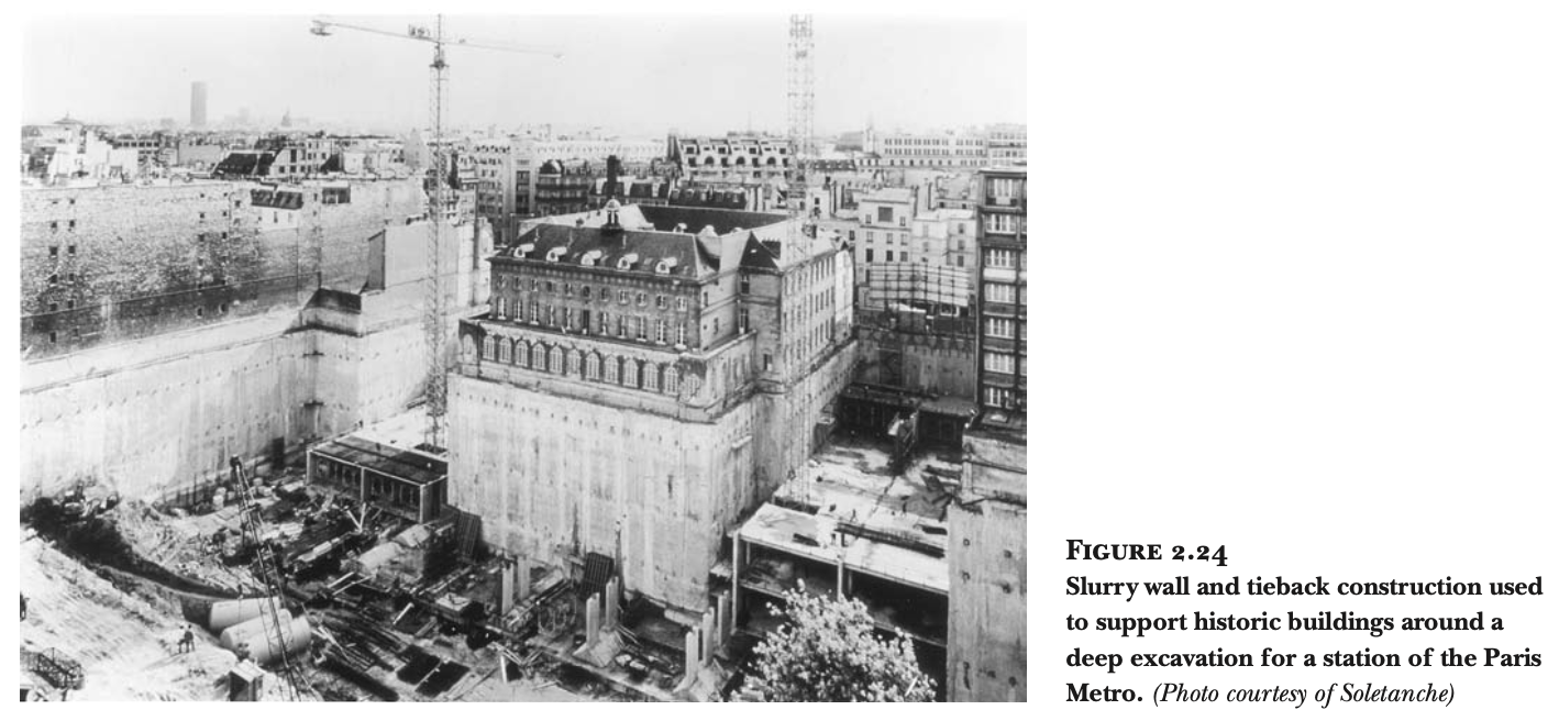 이는 주변 토양에서 물을 펌핑하여 수위를 굴착 바닥 아래로 낮추거나, 슬러리 월(slurry wall)[슬러리 월에 대한 이전 글 참조]과 같은 방수벽을 굴착 주변에 설치하여 달성할 수 있습니다 (그림 2.26 참조).