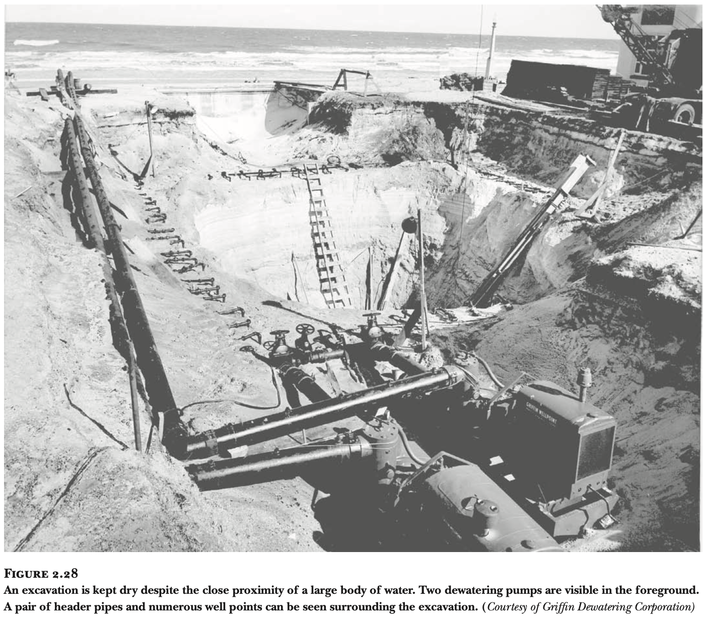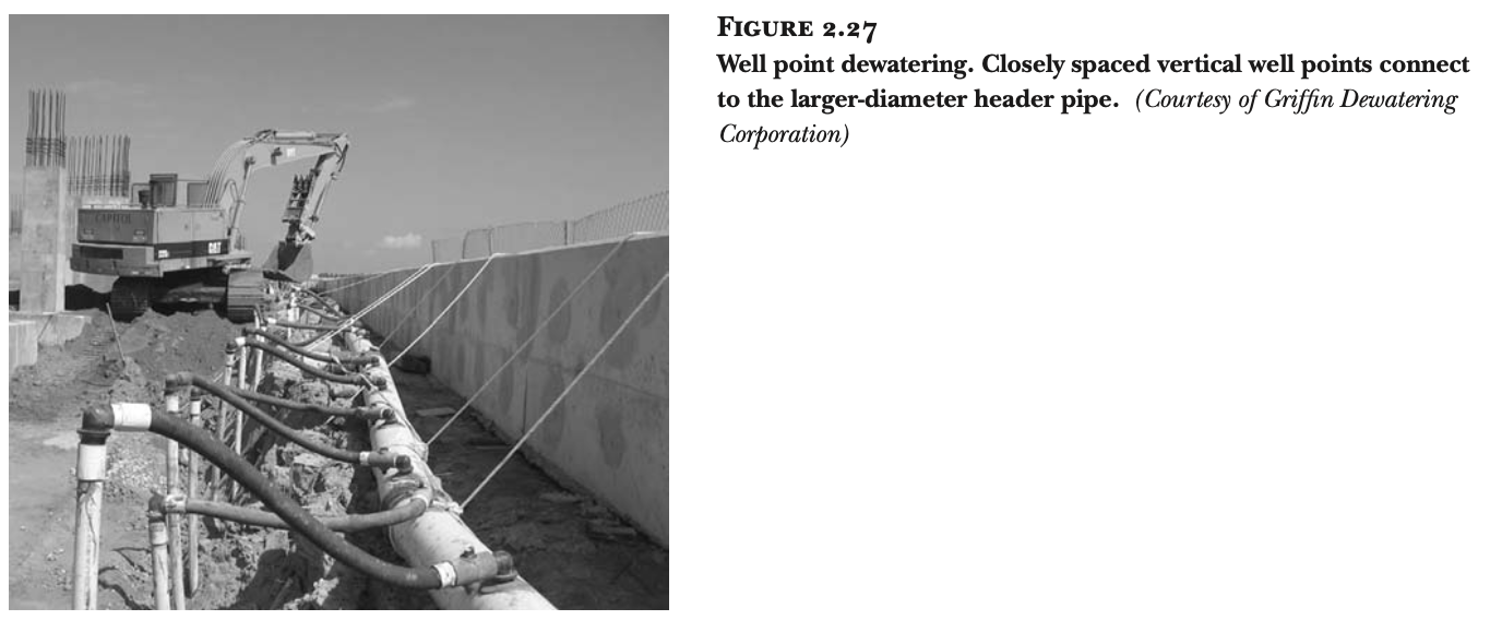 웰 포인트(well point)는 수위를 낮추는 데 흔히 사용됩니다. 이는 바닥에 토양 입자는 걸러내고 물만 통과시키는 구멍이 뚫린 수직 파이프 섹션입니다. 조밀하게 배치된 웰 포인트를 굴착 전체 주변의 토양에 박습니다. 이들은 수평 헤더 파이프로 연결되어 펌프로 이어지며, 펌프는 지속적으로 시스템에서 물을 뽑아 건설 현장에서 멀리 배출합니다. 펌핑으로 굴착 지역의 수위를 낮추면 "건조한 상태"에서 작업을 계속할 수 있습니다 (그림 2.27과 2.28 참조).
