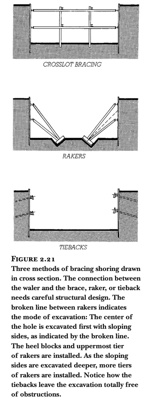 모든 형태의 사면 지지대와 굴착 지지대는 굴착이 깊어짐에 따라 토압과 수압에 대해 버팀목으로 지지되어야 합니다 (그림 2.21 참조). 크로스롯 브레이싱(crosslot bracing)은 임시 강철 H형강을 사용하며, 이는 지지대가 교차할 지점에 파일 드라이버로 지중에 박습니다. 흙을 파내고 차수벽과 기둥 주변을 굴착해 나가면서, 보통 강철로 만든 수평 버팀대를 층층이 추가하여 웨일러(waler)를 지지합니다. 웨일러는 차수벽 면을 가로질러 뻗은 보입니다.