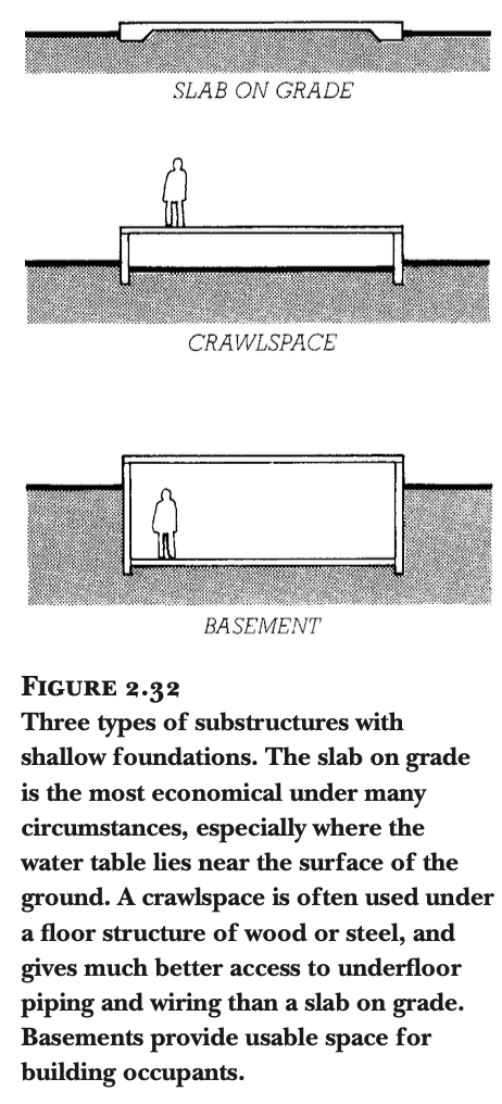 한편, 더 추운 지역에서는 슬래브 온 그레이드의 가장자리를 동결선 아래의 토양에 닿는 더 깊은 벽체 푸팅으로 지지할 수 있습니다. 지면에서 올려진 바닥의 경우, 크롤 스페이스(crawl space) 또는 지하실 위에 있을 때, 콘크리트 연속 푸팅 위에 지지된 콘크리트 또는 조적조 기초 벽체로 지지됩니다 (그림 2.32 참조).