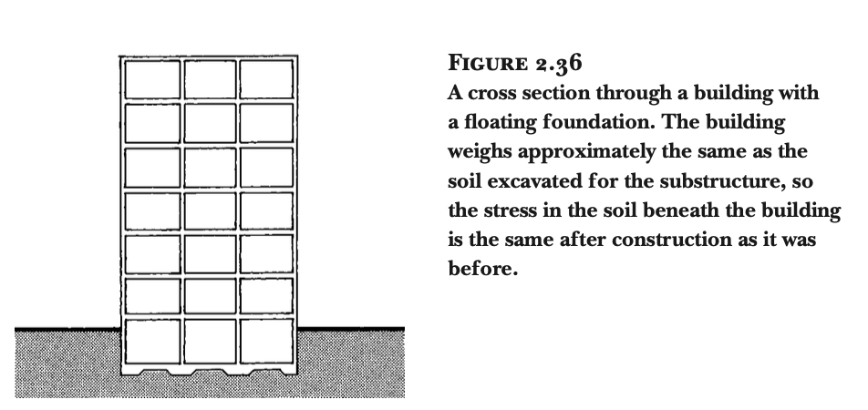 토양의 지지력이 낮고 침하를 세심하게 제어해야 하는 경우, 때때로 부유 기초(floating foundation)가 사용됩니다. 부유 기초는 매트 기초와 유사하지만, 건물 아래에 위치하며 그 깊이는 굴착된 토양의 무게가 위의 건물 무게와 같아지도록 설정됩니다. 일반적으로 굴착된 토양 한 층의 무게는 토양의 밀도와 건물 구조에 따라 5~8층 높이의 상부구조 무게와 비슷합니다 (그림 2.36 참조).