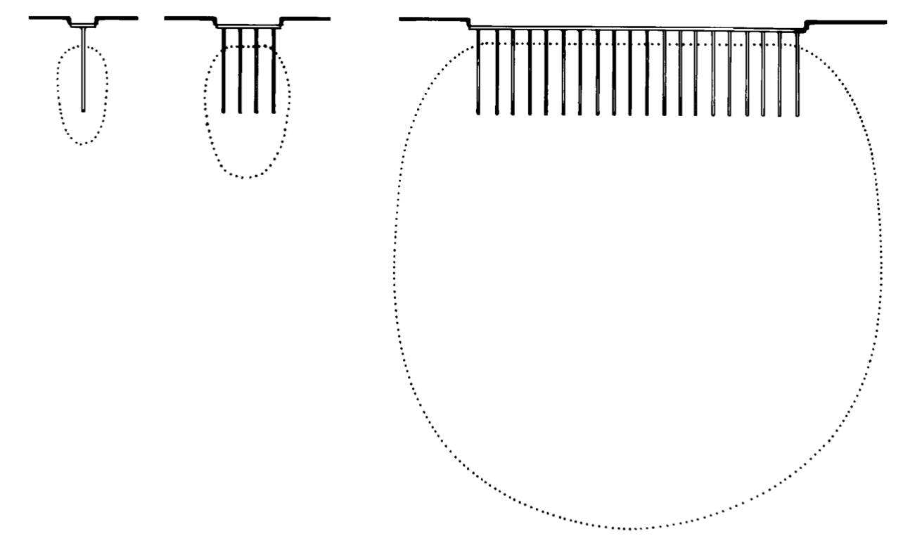 마찰 말뚝은 실트질, 점토질, 모래질 토양에서 가장 효과적입니다. 이들은 선단지지 말뚝처럼 거부까지가 아니라, 미리 정해진 깊이나 해머 타격에 대한 특정 수준의 저항이 나타날 때까지 박힙니다. 마찰 말뚝 군은 상부 구조물의 집중 하중을 군 주변과 아래의 넓은 토양 부피로 분산시키는 효과가 있으며, 이때 발생하는 응력은 토양의 허용 능력 내에 안전하게 머무릅니다 (그림 2.44 참조).