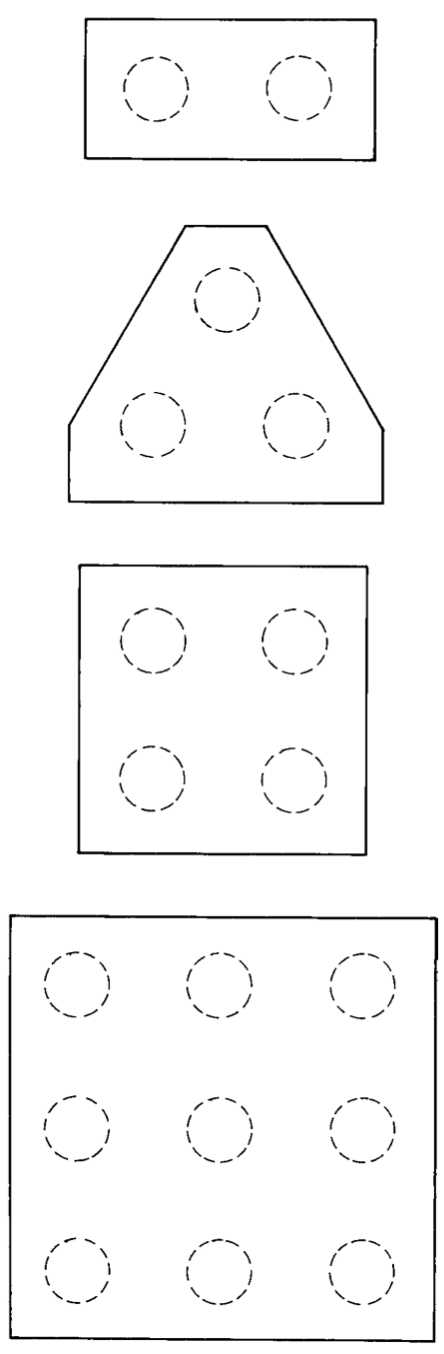 말뚝은 보통 2개에서 25개까지 밀접하게 모여 군(群)을 이루어 박힙니다. 각 군의 말뚝들은 나중에 상부에서 철근 콘크리트 말뚝 캡(pile cap)으로 연결되어, 위의 기둥이나 벽체의 하중을 여러 말뚝에 분산시킵니다 (그림 2.42 및 2.43 참조).