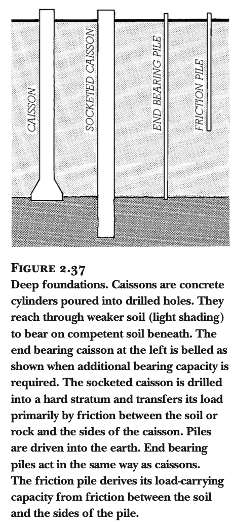 케이슨 또는 드릴드 피어(drilled pier)는 (그림 2.37 참조) 기둥 푸팅과 유사하게 기둥의 하중을 토양의 허용 응력을 초과하지 않는 충분히 넓은 면적으로 분산시킵니다. 그러나 케이슨은 건물 하부구조 아래의 부적합한 토양층을 관통하여 더 적합한 지층에 도달한다는 점에서 기둥 푸팅과 다릅니다.