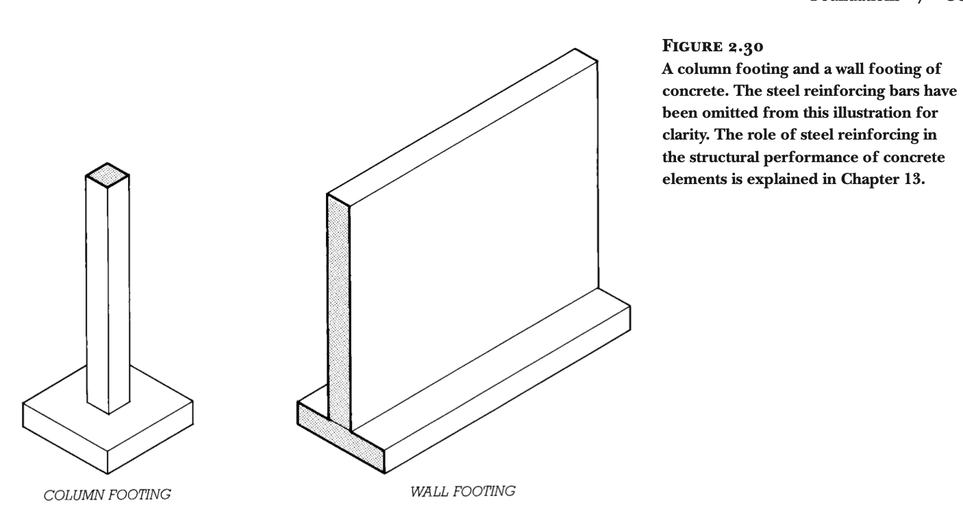 대부분의 얕은 기초는 간단한 콘크리트 푸팅(footing)입니다. 기둥 푸팅은 정사각형 모양의 콘크리트 블록으로, 철근 보강이 있을 수도 있고 없을 수도 있습니다. 이 푸팅은 위에서 오는 건물 기둥의 집중 하중을 받아 토양의 허용 지지력을 초과하지 않는 충분히 넓은 면적으로 하중을 분산시킵니다. 벽체 푸팅 또는 연속 푸팅은 하중을 지지하는 벽체를 위해 같은 기능을 하는 연속된 콘크리트 띠입니다 (그림 2.30 및 2.31 참조).