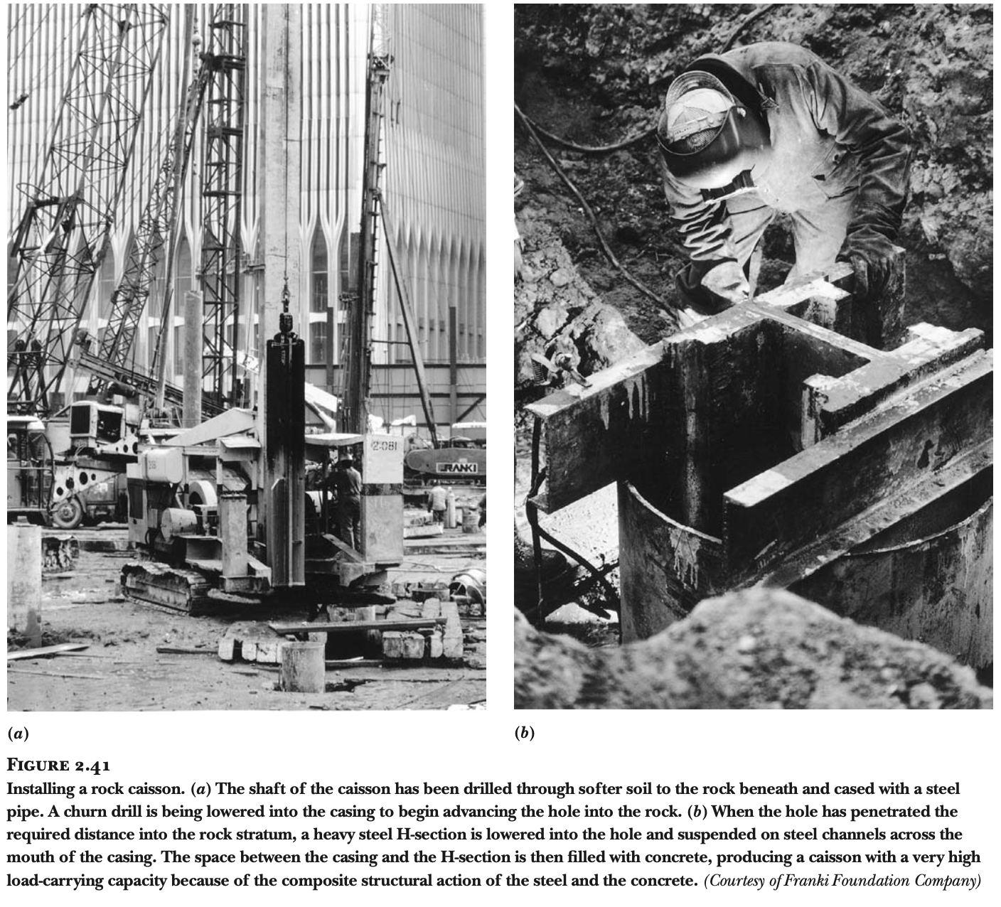 소켓형 케이슨(socketed caisson) (그림 2.37 참조)은 바닥에서 벨 대신 암반으로 뚫어 들어갑니다. 이 케이슨의 지지력은 끝단 지지뿐만 아니라 케이슨 측면과 암반 사이의 마찰력에서도 나옵니다. 그림 2.41은 록 케이슨(rock caisson) 또는 드릴드인 케이슨(drilled-in caisson)의 설치를 보여줍니다. 이는 강철 H형강 코어가 있는 특수한 형태의 소켓형 케이슨입니다.