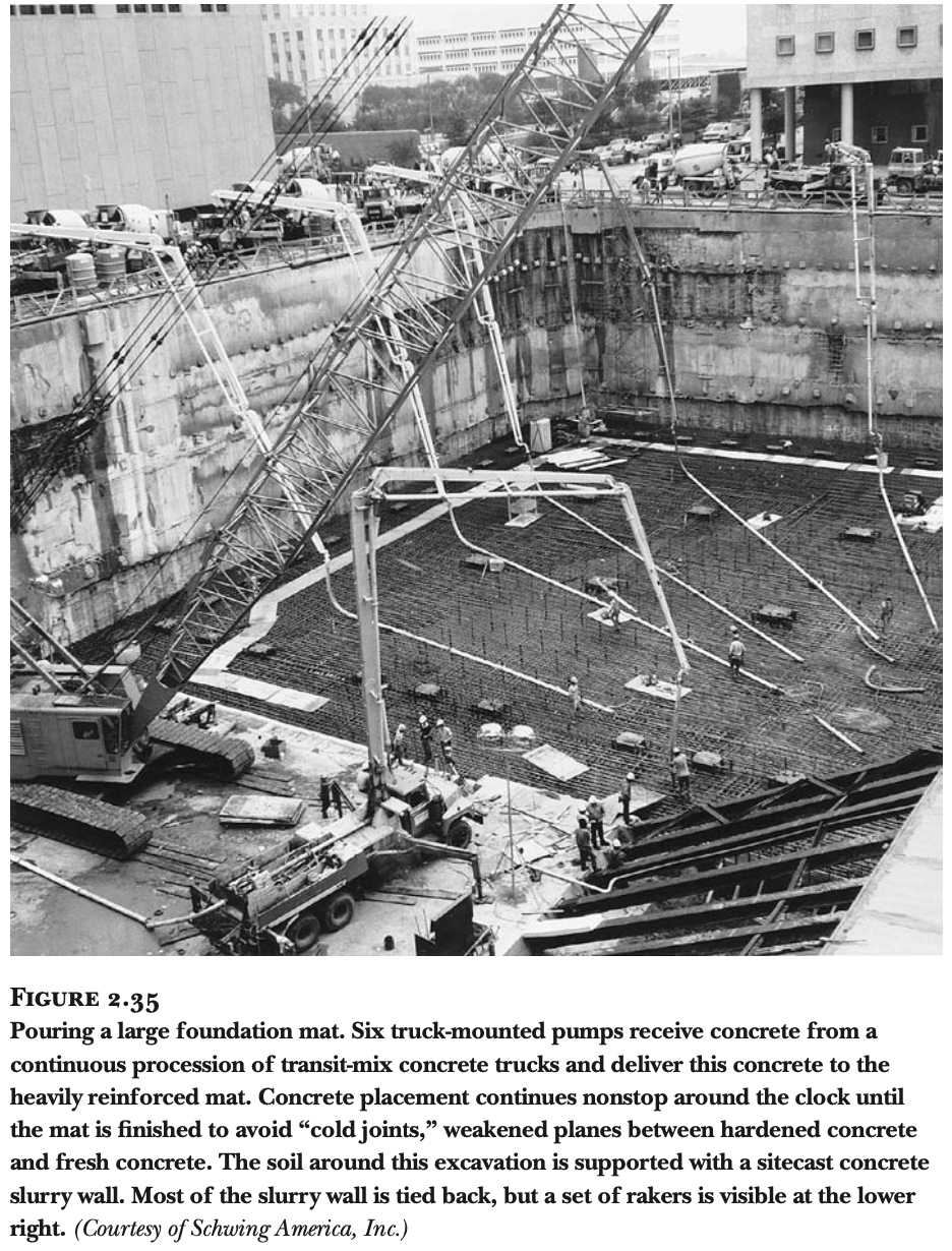 토양의 허용 지지력이 건물 무게에 비해 낮은 상황에서는 기둥 푸팅이 너무 커져서 개별 푸팅을 사용하는 것보다 전체 건물을 지지하는 하나의 매트(mat) 또는 래프트(raft) 기초를 사용하는 것이 더 경제적일 수 있습니다. 매우 높은 건물의 매트 기초는 두께가 6피트(1.8m) 이상일 수 있으며 철근으로 많이 보강됩니다 (그림 2.35 참조).