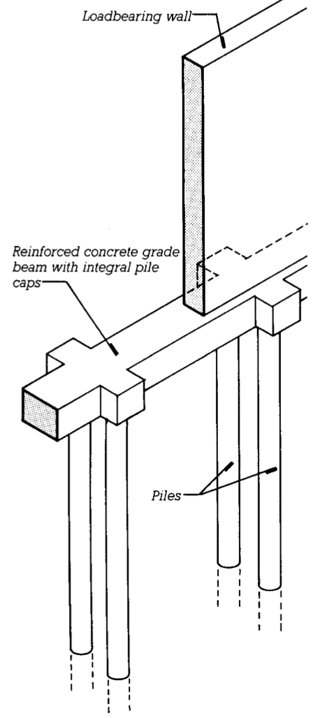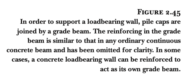 하중을 지지하는 벽체에 말뚝을 사용할 때는, 말뚝 캡 사이에 철근 콘크리트 그레이드 빔(grade beam)을 설치하여 벽체 하중을 말뚝으로 전달합니다 (그림 2.45 참조). 그레이드 빔은 케이슨 기초에서도 같은 목적으로 사용됩니다.