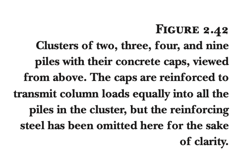 말뚝은 보통 2개에서 25개까지 밀접하게 모여 군(群)을 이루어 박힙니다. 각 군의 말뚝들은 나중에 상부에서 철근 콘크리트 말뚝 캡(pile cap)으로 연결되어, 위의 기둥이나 벽체의 하중을 여러 말뚝에 분산시킵니다 (그림 2.42 및 2.43 참조).