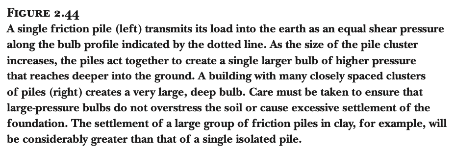 마찰 말뚝은 실트질, 점토질, 모래질 토양에서 가장 효과적입니다. 이들은 선단지지 말뚝처럼 거부까지가 아니라, 미리 정해진 깊이나 해머 타격에 대한 특정 수준의 저항이 나타날 때까지 박힙니다. 마찰 말뚝 군은 상부 구조물의 집중 하중을 군 주변과 아래의 넓은 토양 부피로 분산시키는 효과가 있으며, 이때 발생하는 응력은 토양의 허용 능력 내에 안전하게 머무릅니다 (그림 2.44 참조).