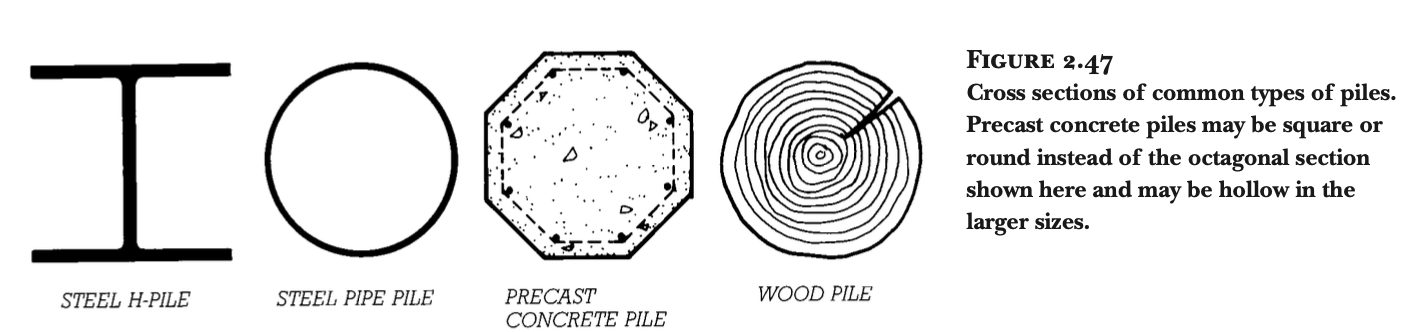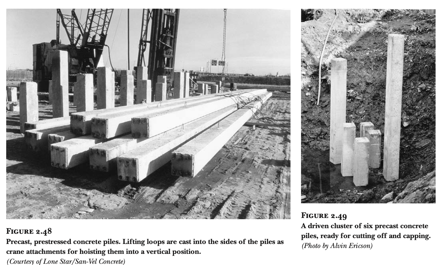 프리캐스트 콘크리트 말뚝은 정사각형, 팔각형, 또는 원형 단면을 가지며, 대형의 경우 종종 검사를 위한 중공 코어가 있습니다 (그림 2.47-2.49 참조). 대부분은 프리스트레스트(prestressed) 처리되지만, 일부 소형 건물용은 단순히 철근으로만 보강됩니다. 일반적인 단면 치수는 10-16인치(250-400mm)이며, 하중 지지 능력은 45톤 - 500톤(40,000kg - 450,000kg) 범위입니다.