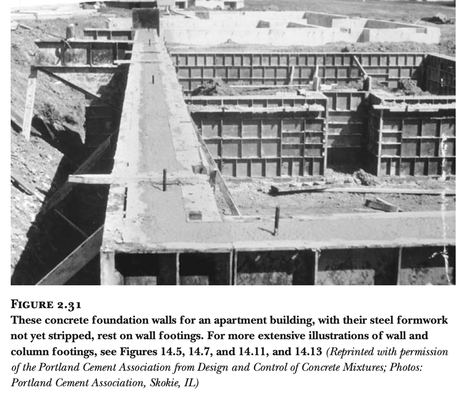 대부분의 얕은 기초는 간단한 콘크리트 푸팅(footing)입니다. 기둥 푸팅은 정사각형 모양의 콘크리트 블록으로, 철근 보강이 있을 수도 있고 없을 수도 있습니다. 이 푸팅은 위에서 오는 건물 기둥의 집중 하중을 받아 토양의 허용 지지력을 초과하지 않는 충분히 넓은 면적으로 하중을 분산시킵니다. 벽체 푸팅 또는 연속 푸팅은 하중을 지지하는 벽체를 위해 같은 기능을 하는 연속된 콘크리트 띠입니다 (그림 2.30 및 2.31 참조).