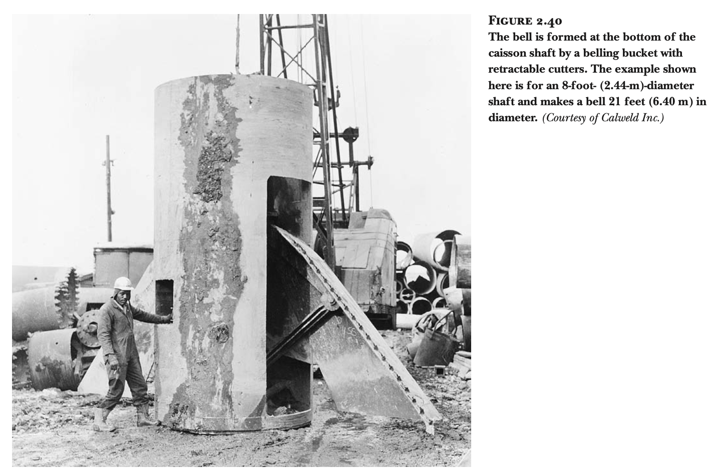 일반적으로 드릴이 진행됨에 따라 임시 원통형 강철 케이싱을 구멍 주변으로 내려 토양을 지지합니다. 단단한 지지층에 도달하면, 필요한 경우 수작업 굴착이나 특수 벨링 버킷(belling bucket)을 사용하여 샤프트 바닥에 벨을 만듭니다 (그림 2.40 참조). 그 후 구멍 바닥의 지지면을 검사하여 예상된 품질인지 확인하고, 콘크리트를 채우면서 케이싱을 빼냅니다.