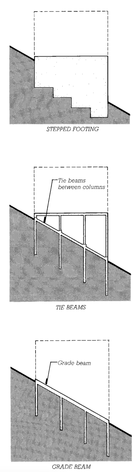 경사진 지형에 건설할 때는 종종 건물 주변의 모든 지점에서 필요한 푸팅 깊이를 유지하기 위해 푸팅을 계단식으로 설치해야 합니다 (그림 2.33 참조). 토양 조건이나 지진 대비책이 필요한 경우, 가파른 경사면의 기둥 푸팅은 푸팅 간의 차등 슬립(differential slip)을 방지하기 위해 철근 콘크리트 타이 빔(tie beam)으로 연결될 수 있습니다.