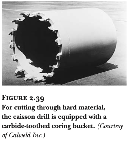 소켓형 케이슨(socketed caisson) (그림 2.37 참조)은 바닥에서 벨 대신 암반으로 뚫어 들어갑니다. 이 케이슨의 지지력은 끝단 지지뿐만 아니라 케이슨 측면과 암반 사이의 마찰력에서도 나옵니다. 그림 2.41은 록 케이슨(rock caisson) 또는 드릴드인 케이슨(drilled-in caisson)의 설치를 보여줍니다. 이는 강철 H형강 코어가 있는 특수한 형태의 소켓형 케이슨입니다.