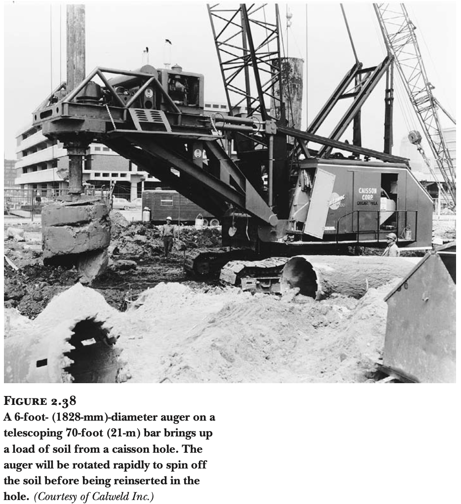 케이슨은 구멍을 뚫거나 손으로 파고, 필요에 따라 바닥을 벨(bell) 모양으로 확장하여 필요한 지지 면적을 확보한 후, 구멍을 콘크리트로 채워 만듭니다. 대형 오거 드릴(auger drill)이 케이슨 구멍을 뚫는 데 사용되며 (그림 2.38 및 2.39 참조), 토양에 바위가 너무 많아 드릴 작업이 불가능한 경우에만 수작업 굴착이 이루어집니다.