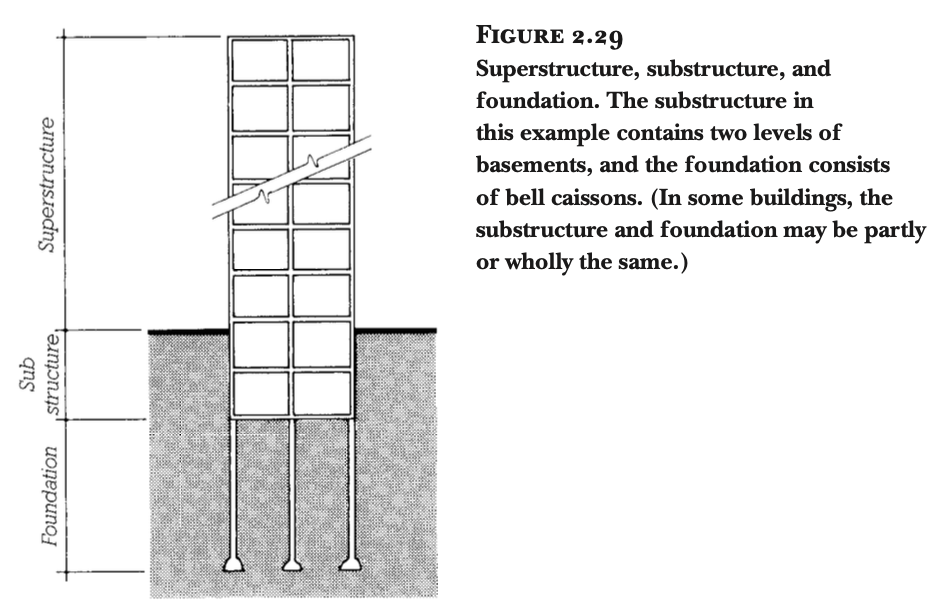 건물은 크게 세 부분으로 구성된다고 생각하면 편리합니다: 지상 부분인 상부구조(superstructure), 지하 거주 공간인 하부구조(substructure), 그리고 건물의 하중을 지반으로 전달하는 기초(foundations)입니다 (그림 2.29 참조).