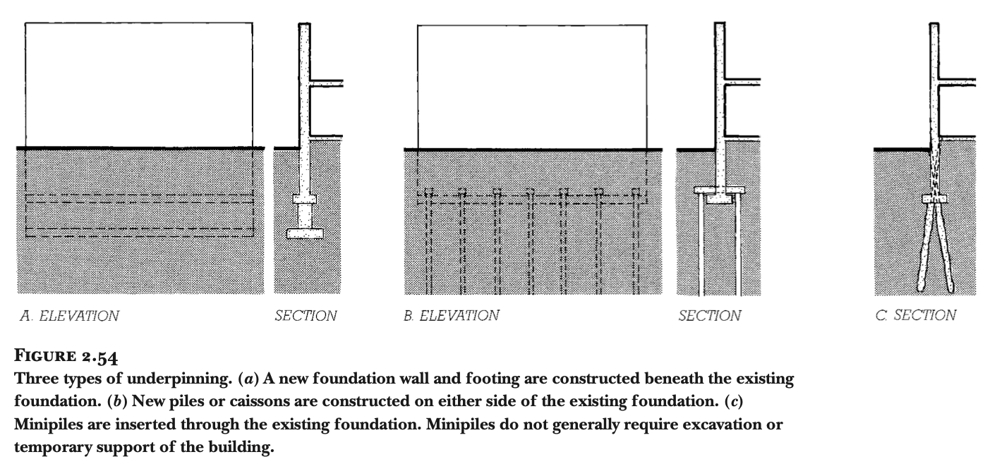 미니 말뚝(minipiles), 핀 말뚝(pin piles) 또는 마이크로 말뚝(micropiles)이라고도 불리는 경량 강재 말뚝은 직경 2-12인치(50-300mm)의 강봉이나 강관으로 만들어집니다. 미니 말뚝은 토양에 뚫은 구멍에 삽입한 후 그라우팅으로 고정합니다. 기존 건물 내부에 설치할 때는 말뚝에 아래로, 건물 구조에 위로 유압 잭으로 힘을 가해 토양에 밀어 넣기도 합니다. 해머 타격이 필요 없어 기존 구조물에 손상을 줄 수 있는 진동이나 건물 내 진행 중인 활동에 지장을 주지 않아 기존 기초의 보수나 개선에 좋은 선택입니다 (그림 2.54 참조).