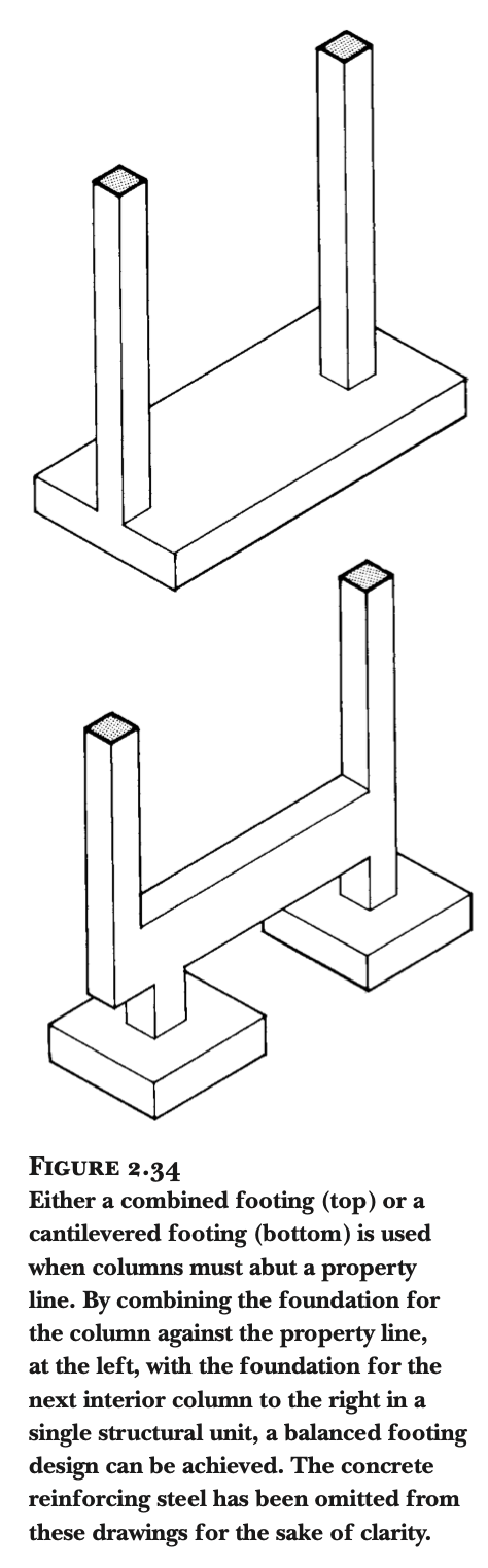 법적으로 푸팅은 부지 경계선을 넘어설 수 없습니다. 이는 건물이 경계선에 바짝 붙어 지어질 때도 마찬가지입니다. 만약 푸팅의 바깥쪽 끝을 단순히 부지 경계선에서 잘라낸다면, 푸팅은 기둥이나 벽체에 의해 대칭적으로 하중을 받지 못하게 되어 회전하려는 경향이 생기고 결국 파괴될 수 있습니다. 이러한 문제를 해결하기 위해 복합 푸팅(combined footing)과 캔틸레버 푸팅(cantilever footing)이 사용됩니다. 이들은 바깥쪽 열의 기둥 푸팅을 다음 열의 푸팅과 연결하여 회전 경향을 중화시킵니다 (그림 2.34 참조).