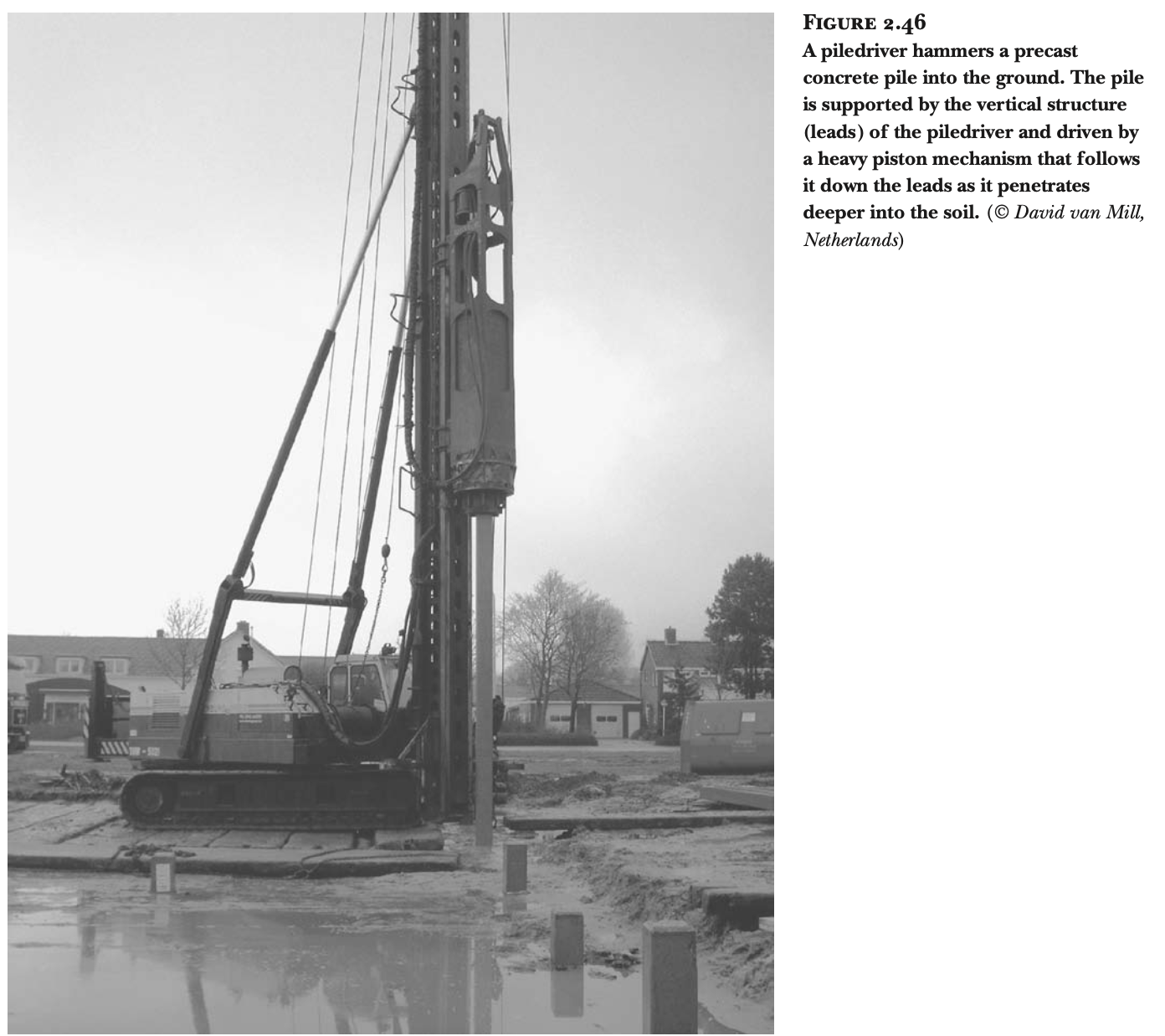 해머는 파일 드라이버 전면의 '리드(leads)'라고 불리는 높은 수직 레일을 따라 이동합니다 (그림 2.46 참조). 박기 시작 시 각 말뚝의 상단으로 먼저 올려진 다음, 말뚝이 지반에 관입됨에 따라 아래로 따라갑니다. 파일 드라이버 메커니즘에는 박기 전 각 말뚝을 제자리로 들어 올리는 장비도 포함되어 있습니다.