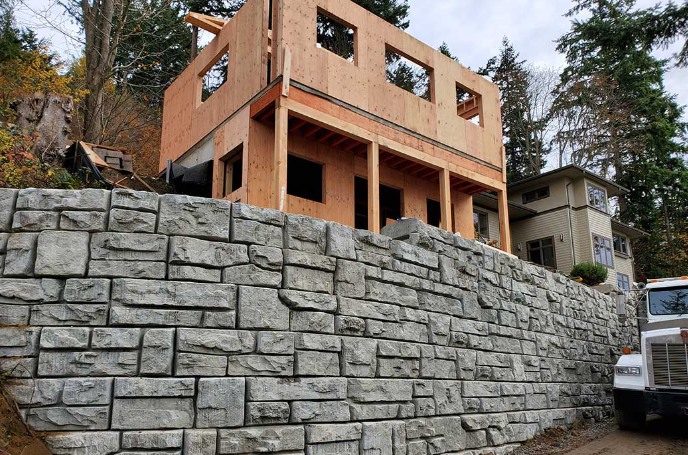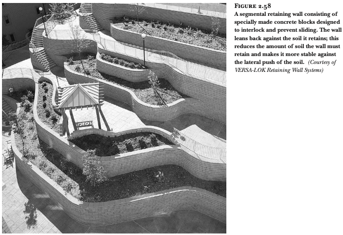 또한 인터로킹(interlocking) 방식의 콘크리트 블록을 이용한 독점 시스템도 있는데, 이는 강철 보강재 없이 경사진 분절식 옹벽을 건설하는 데 사용됩니다(그림 2.58 참조).