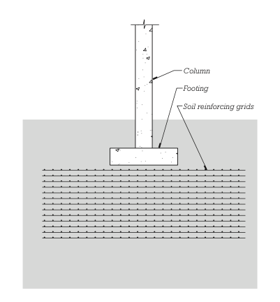 앞서 설명한 대로, 토양 보강에서는 플라스틱 메시 직물이나 그리드를 사용하여 토사 제방이나 옹벽을 지지합니다. 같은 종류의 메시를 여러 층으로 사용하여 얕은 기초 아래의 공학적 성토를 안정화하거나(그림 A 참조), 주차장, 도로, 공항 활주로 아래의 취약한 토양을 안정화하는 데 사용할 수 있습니다. 이는 마치 식물 뿌리가 토양 입자의 이동을 막는 것과 매우 유사한 원리로 작용합니다.