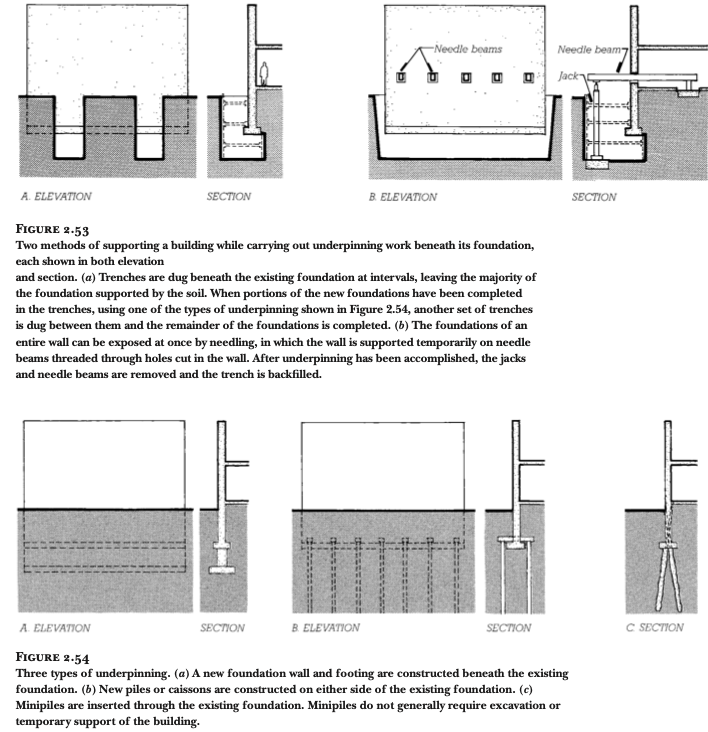 설명: 기초 보강(Underpinning)은 구조적인 문제나 지반 조건의 변화로 인해 필요한 작업입니다. 건물의 외관 개선은 기초 보강의 목적이 아닙니다.