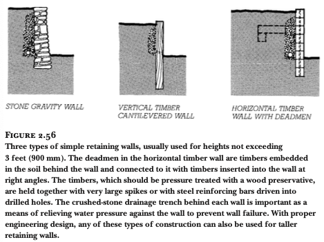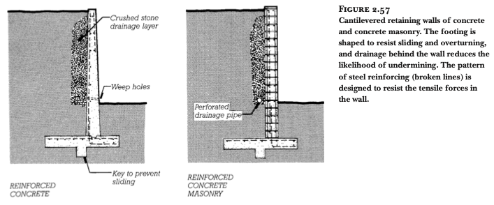 옹벽 건설 방법은 다양합니다. 높이 3피트(약 900mm) 미만의 낮은 옹벽의 경우, 다양한 유형의 단순한 무근 벽체가 적합할 수 있습니다(그림 2.56 참조). 더 높은 옹벽이나 특수한 하중 조건, 또는 지하수 문제가 있는 경우에는 캔틸레버형 콘크리트 옹벽이 가장 자주 사용됩니다(그림 2.57에 두 가지 예시가 나와 있습니다). 캔틸레버형 옹벽의 형태와 보강재는 거의 모든 상황에 맞게 맞춤 설계할 수 있습니다.