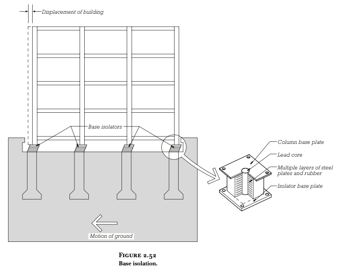 자주 사용되는 기초 격리 장치 유형 중 하나는 고무와 강철판을 여러 겹으로 쌓은 샌드위치 형태의 구조입니다(그림 2.52 참조). 지반과 건물 사이에 상대적인 움직임이 발생하면, 고무층이 전단 변형(shear deformation)을 일으켜 직사각형 모양의 격리 장치가 평행사변형 단면으로 변형될 수 있게 합니다. 중심부에 있는 납 코어(lead core)는 이러한 움직임을 가능하게 할 만큼 충분히 변형되며, 감쇠 작용(damping action)을 제공하고 샌드위치 구조의 각 층이 정렬된 상태를 유지하도록 돕습니다.