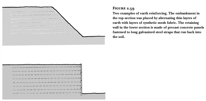 토양 보강(Earth reinforcing, 그림 2.59 참조)은 많은 상황에서 기존 옹벽의 경제적인 대안이 될 수 있습니다. 이 방법은 토양을 얇은 층으로 다져가며, 각 층에 아연도금 강철 띠나 망, 폴리머 섬유, 또는 유리섬유를 넣어 토양을 안정화시킵니다. 이는 마치 식물의 뿌리가 토양을 안정화시키는 것과 유사한 원리입니다.