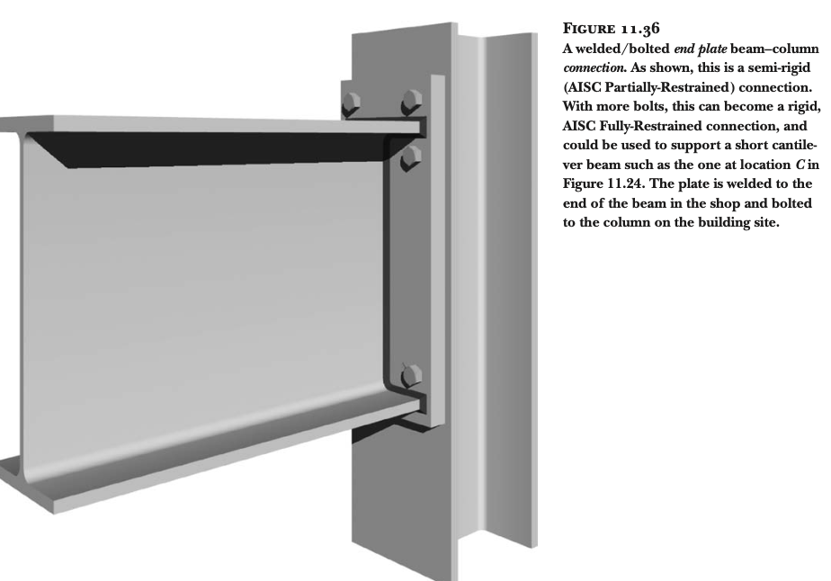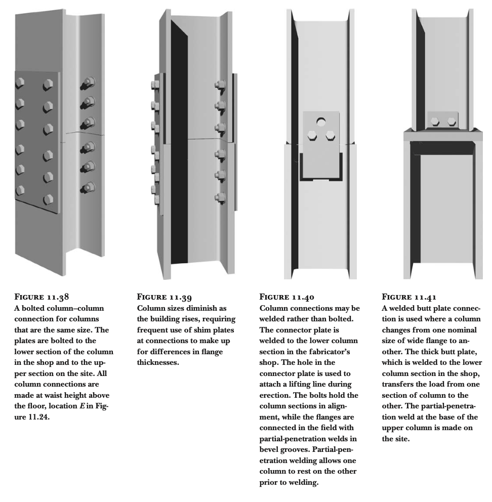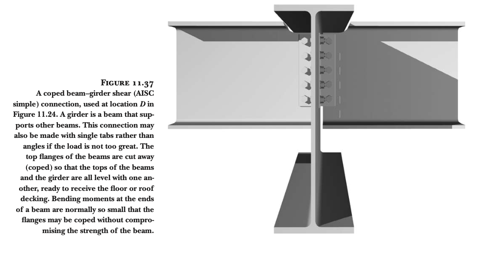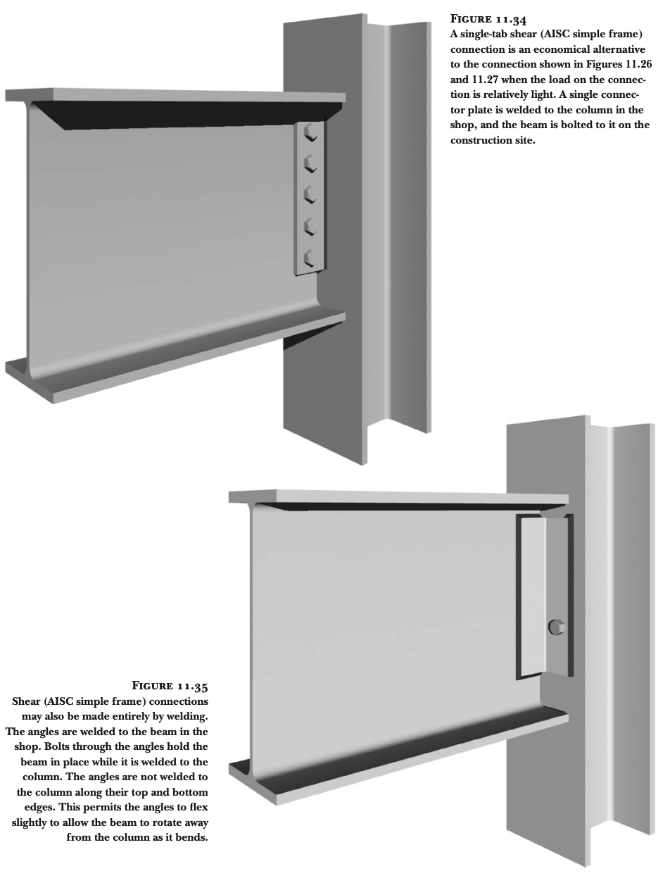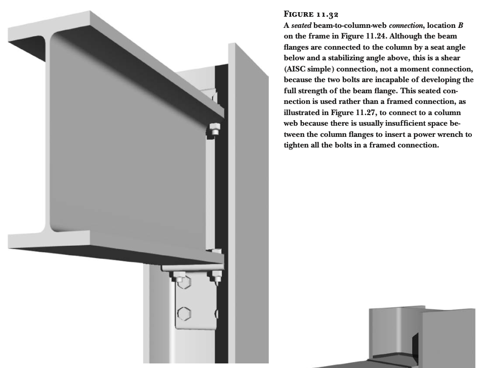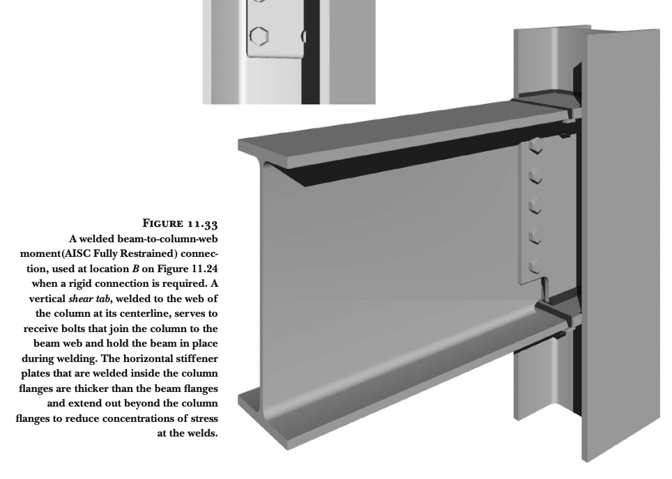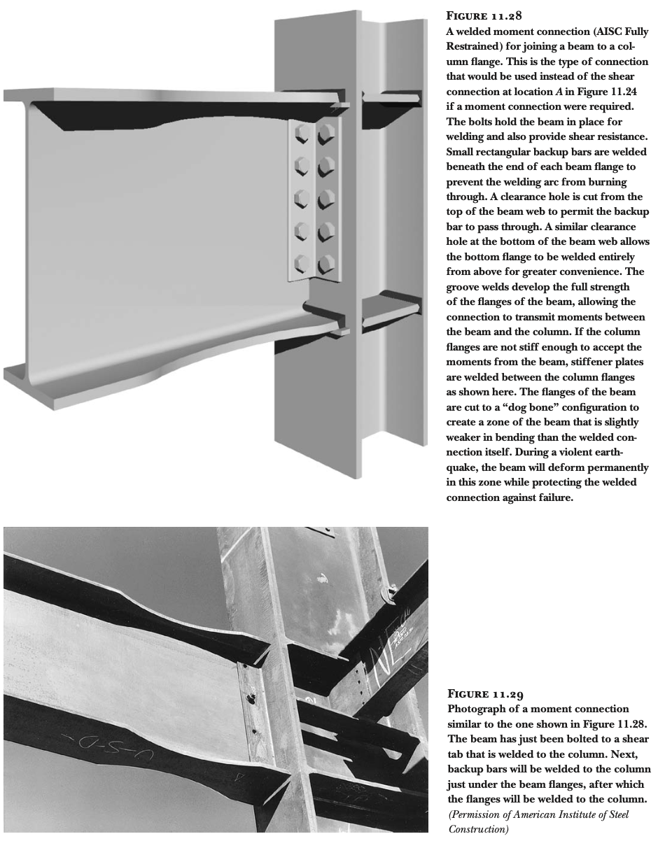 휨력 전달의 한계: 보의 플랜지를 기둥에 연결하지 않기 때문에, 휨력(굽힘 모멘트, bending moment)을 효과적으로 전달하지 못합니다. 휨력을 전달할 수 있는 "모멘트 연결부(moment connection)"를 만들기 위해서는 보의 플랜지를 기둥에 강하게 연결해야 합니다. 이를 위해 가장 일반적으로 사용되는 방법은 완전 용입 그루브 용접(full-penetration groove welds)입니다 (그림 11.28 및 11.29 참조).