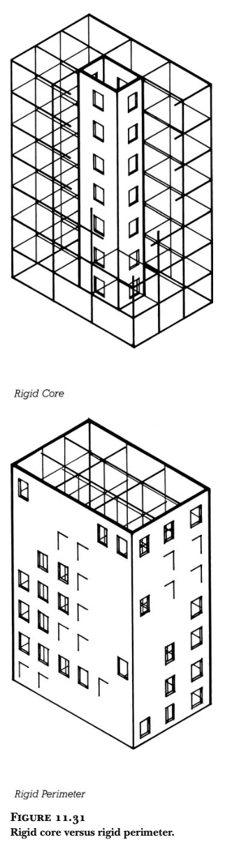 경제성 고려: 모멘트 연결이 전단 연결보다 비용이 많이 들기 때문에, 필요한 만큼만 사용하고 나머지는 더 간단하고 저렴한 전단 연결을 사용합니다. 고층 건물 프레임에서 안정화 요소를 배치하는 두 가지 일반적인 방법 (그림 11.31 참조):