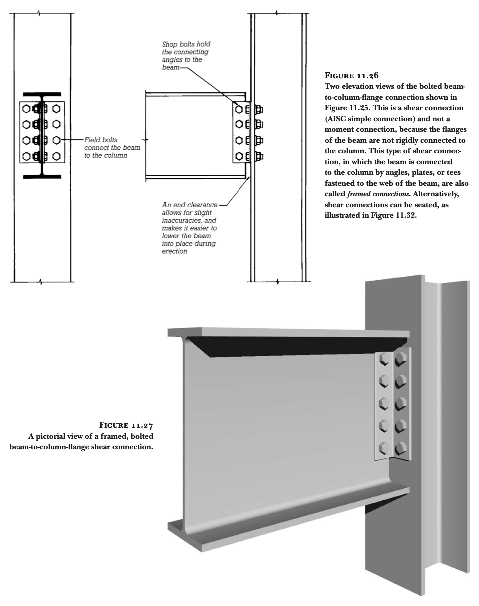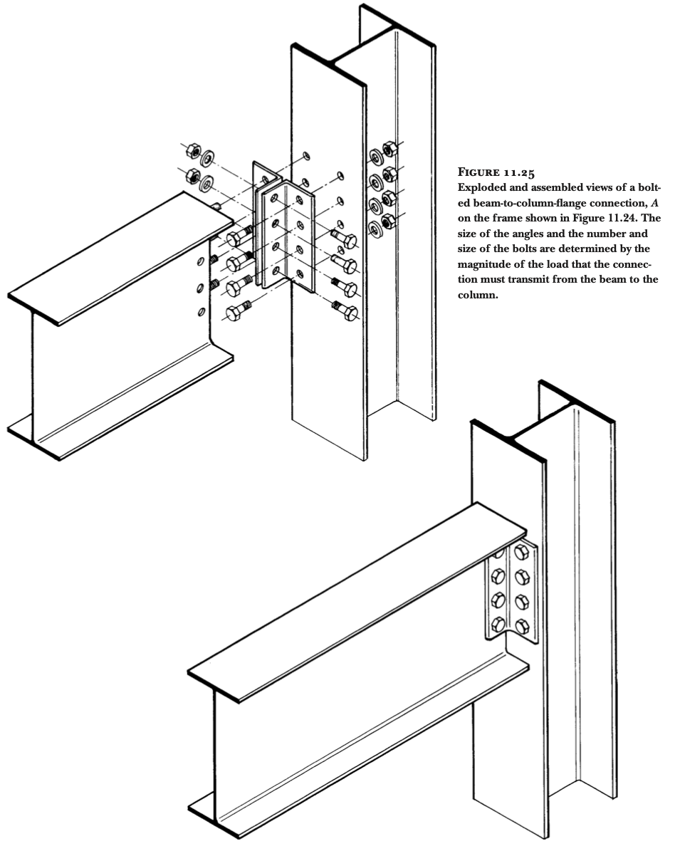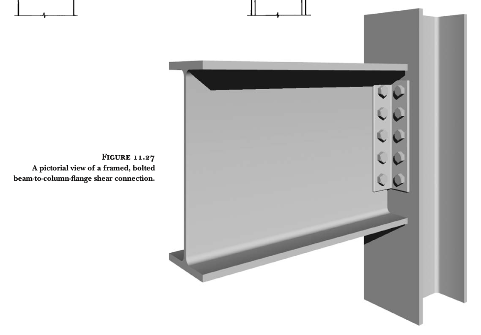 대부분의 강구조 프레임 연결부는 연결되는 부재들 사이에 앵글(angle), 플레이트(plate), 또는 T형강(tee)을 중간 요소로 사용합니다. 가장 기본적인 보-기둥 플랜지 볼트 연결부의 경우, 두 개의 앵글과 여러 개의 볼트가 필요합니다 (그림 11.24 - 11.27 참조).