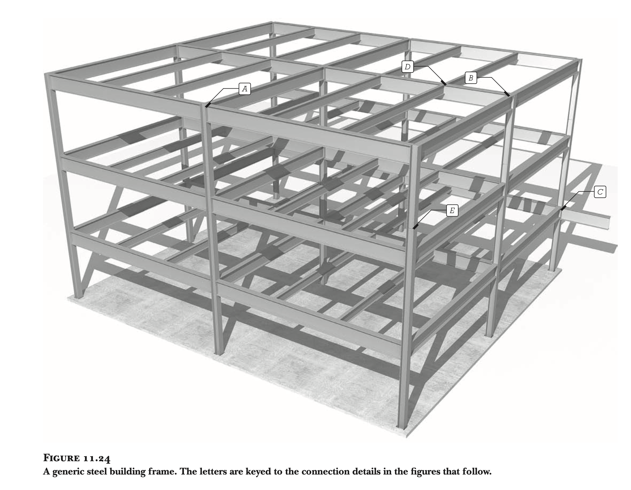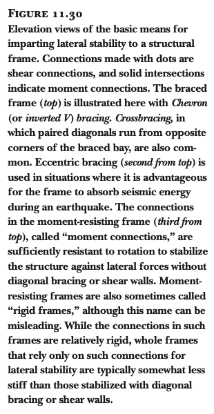 건물 프레임에서 전단 연결부(shear connections)와 모멘트 연결부(moment connections)의 역할을 이해하기 위해서는, 건물이 바람과 지진으로 인한 횡력(lateral forces)에 대해 어떻게 안정성을 확보하는지 알아야 합니다. 일반적으로 사용되는 세 가지 기본적인 안정화 메커니즘은 다음과 같습니다 (그림 11.30 참조):