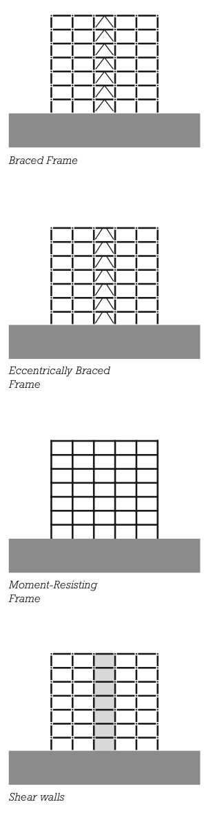 외부 프레임: 나머지 건물 프레임은 전단 연결로 구성될 수 있으며, 바닥과 지붕의 다이어프램 작용(용접된 강철 데크와 콘크리트 토핑과 같은 얇은 판재가 가진 강성)을 통해 강성 코어와 연결되어 안정화됩니다.