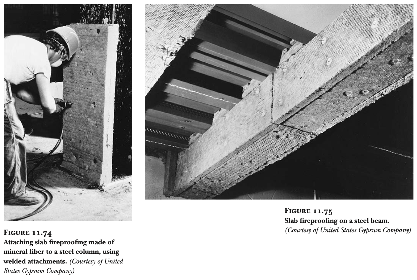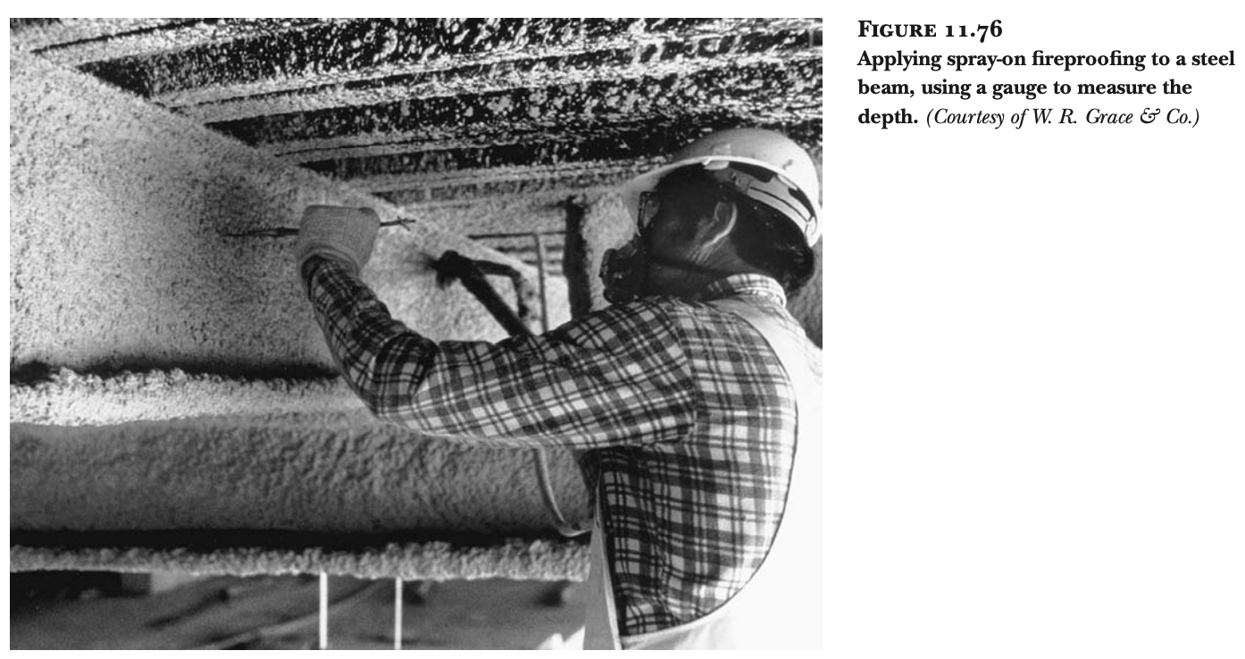 내화 처리 재료가 마감 표면 역할을 할 필요가 없는 경우, 분무 도포형 내화 재료(spray-applied fire-resistive materials, SFRM)가 가장 널리 사용되고 있습니다. 이는 일반적으로 '분무식 내화 처리'(spray-applied fireproofing)라고 불립니다. 이 재료들은 주로 섬유와 결합제의 혼합물이나 시멘트 계열의 혼합물로 구성되며, 필요한 두께로 강철 위에 분무됩니다 (그림 11.76 참조).